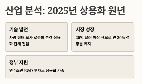 휴머노이드 로봇은 사람 형태를 모사한 로봇으로, 2025년부터 본격 상용화 단계에 진입했습니다. 글로벌 시장규모는 20억 달러 이상이며, 기술 발전과 AI 융합으로 매년 30% 이상 빠르게 커지고 있어요. 한국은 제조업 자동화와 고령화 사회 대응 수요가 휴머노이드 연구·개발을 촉진하며, 정부가 연 1조 원 규모 R&D 및 상용화 지원 사업을 확대하고 있습니다. 국내외 기업들은 상업적 수용과 다양한 응용 분야 확대에 힘쓰고 있죠. 휴머노이드 로봇은 의료 지원, 재활 보조, 교육 보조, 접객 서비스 등에서 적용 가능성이 꾸준히 확인되고 있습니다.🤖🏥📚💼