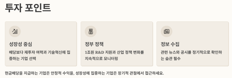 휴머노이드 로봇 산업은 기술상 진입장벽이 높고 자본집약적이어서 성장 가능성과 위험이 공존합니다. 종목별로 재무 안정성을 검토하면서 신기술 도입과 해외시장 확대 계획을 주의 깊게 살펴야 합니다. 초기 투자자들은 장기적인 관점에서, 기술개발과 시장확장 가능성이 높은 업체를 우선 고려하세요. 배당 수익보다 성장성에 초점을 둔 기업은 재투자 여력이 중요하며, 현금배당 기업은 안정적인 수익 추구에 적합합니다.🤖💰