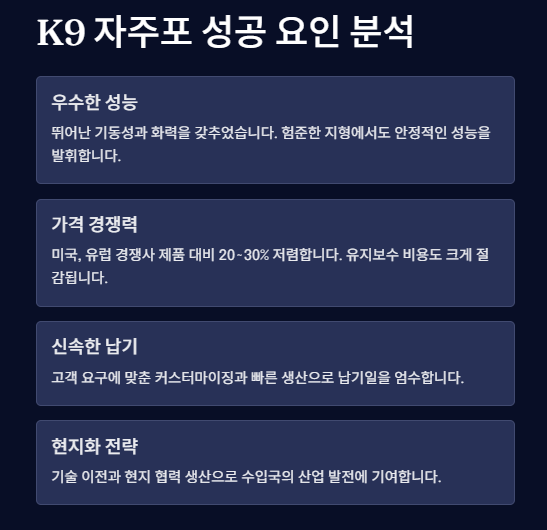■ K9 자주포는 2024년 기준 세계 자주포 수출 시장의 58% 점유율을 차지하며 1위를 고수 중입니다. 2032년까지 63.8% 시장 점유율 달성이 예상되며, 이는 미국·러시아 제품을 압도하는 수치입니다.