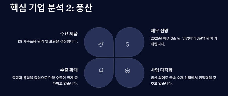 | SNT다이내맥스(003570) | 5,200억 원(+215%) | 8.9% | 포신 부품 독점 공급 |